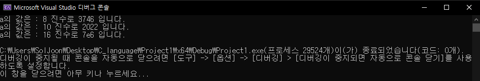 그러면 정상적으로 8진수, 16진수로 나왔는지 확인해봅시다.