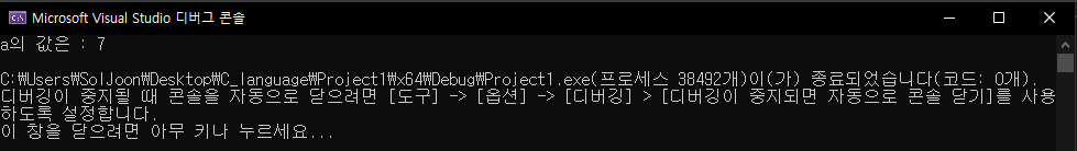 실행 결과, "a의 값은 : 7"이라는 문장이 출력 되었네요.