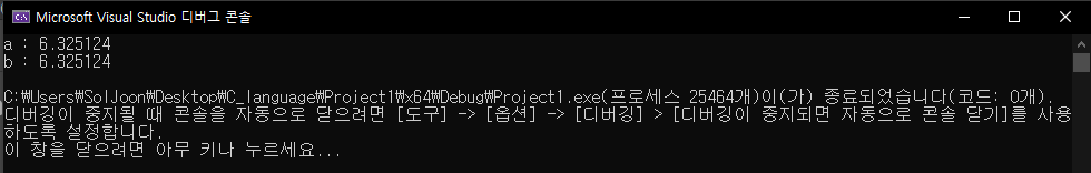 그 결과, a : 6.325124 / b : 6.325124 로 동일한 결과가 나왔네요.