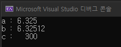 그 결과 a : 6.325 / b : 6.32512 / c : 300이 나왔네요.