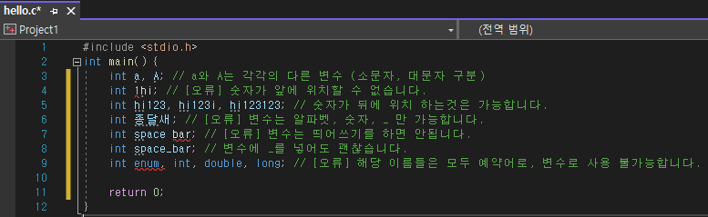 | 2 | int 1hi; | [오류] 숫자가 앞에 위치할 수 없습니다. |