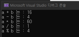 printf("a + b 는 : %d \n", a + b); // 결과는 16