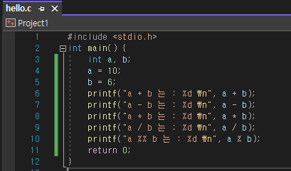 printf("a - b 는 : %d \n", a - b); // 결과는 4