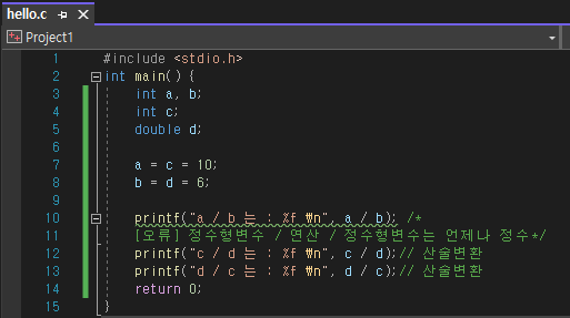 printf("c / d 는 : %f \n", c / d); // 결과 1.66667