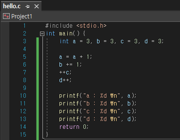 약간은 생소한 += 연산입니다. 이러한 연산을 복합 대입연산 이라고 하며, b = b + 1 라는 의미와 같습니다. 이렇게 쓰는 이유는 b = b + 1 전부를 쓰기 귀찮아서 입니다.
