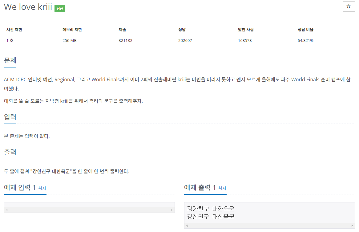 - 문제 : 두 줄에 걸쳐 "강한친구 대한육군"을 한 줄에 한 번씩 출력한다.