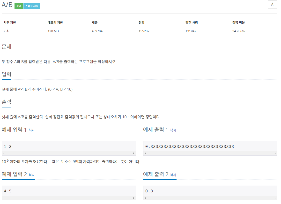 - 특이사항 : 첫째 줄에 A/B를 출력한다. 실제 정답과 출력값의 절대오차 또는 상대오차가 10^(-9) 이하이면 정답이다.