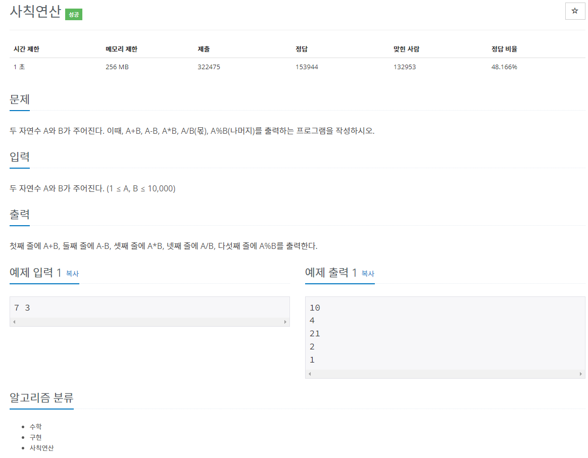 - 문제 : 첫째 줄에 A+B, 둘째 줄에 A-B, 셋째 줄에 A*B, 넷째 줄에 A/B, 다섯째 줄에 A%B를 출력한다.