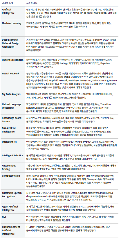 - 급격하게 발전하고 있는 인공지능 기술을 다양한 학문 분야와 융합할 수 있도록 국제적으로 우수한 교육 프로그램을 개설하여 인재를 육성하고 창의적인 연구를 수행할 수 있게 하기 위함