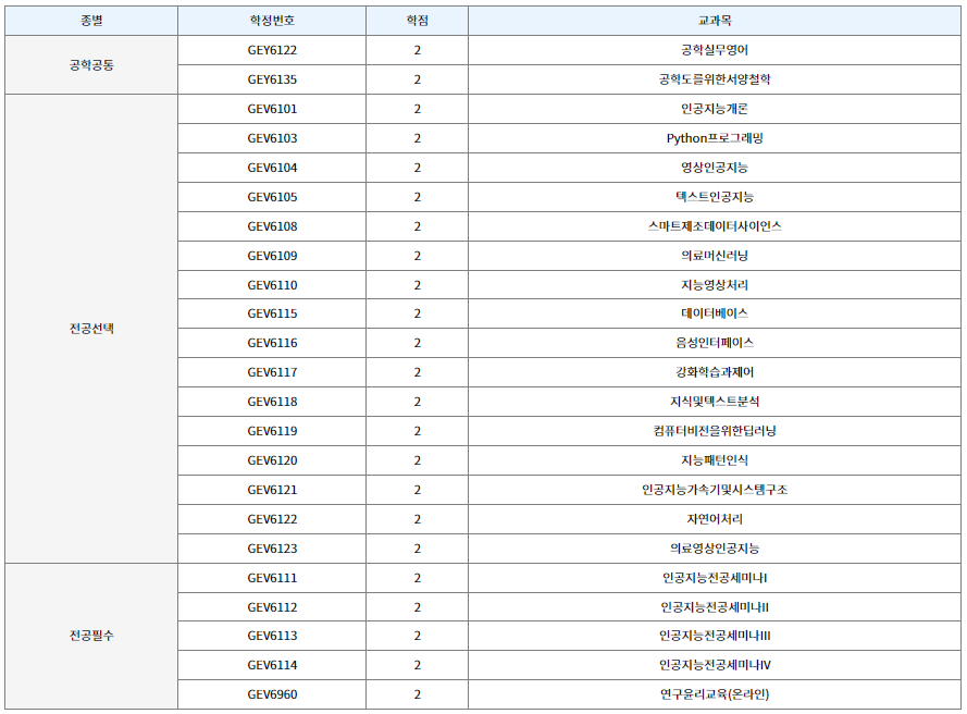 - 인공지능 최신 이론을 기반으로 이를 다양한 응용 분야에 접목하여 인공지능 시스템을 설계, 구현할 수 있는 인공지능 응용전문가 양성을 목표로 함